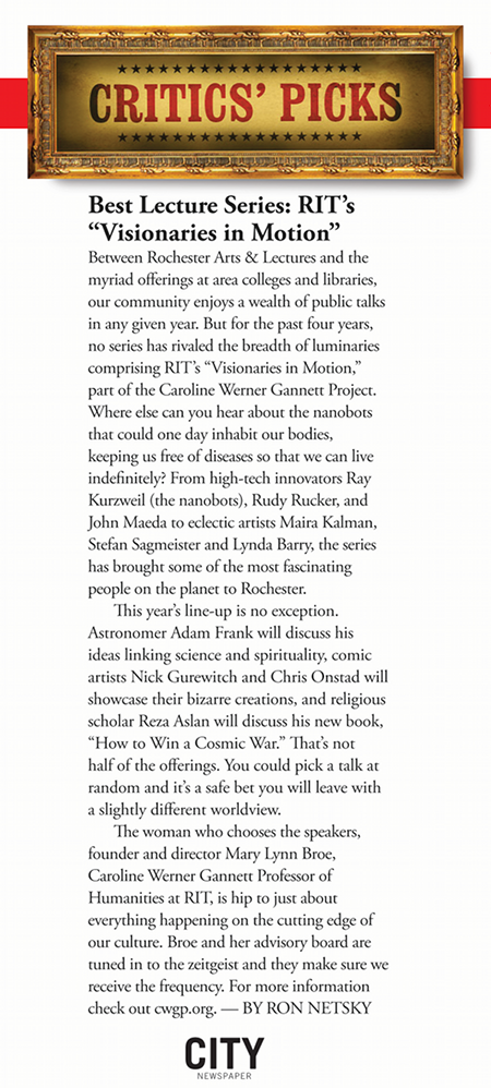 The 2011-12 Visionaries in Motion V is dedicated to the memory of Stephanie Kirschen Cole (1945-2011), brilliant artist, designer, collagist and professor who served as Gannett Project’s web designer and graphic artist from 2006-2011. Our visionaries website will remain up, visible and usable.Open Letter to RIT Faculty, Students, and Staff CLICK HERE FOR SPEAKERS’S COMMENTS: The Caroline Werner Gannett project was named the Best Lecture Series in the Rochester area by City magazine.